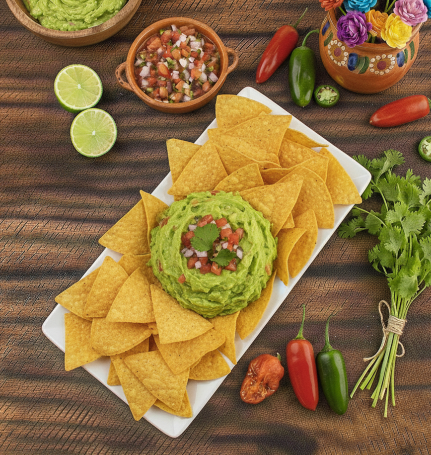 Fresh mashed avocado with onion, tomato, lime, served with crispy tortilla chips.
