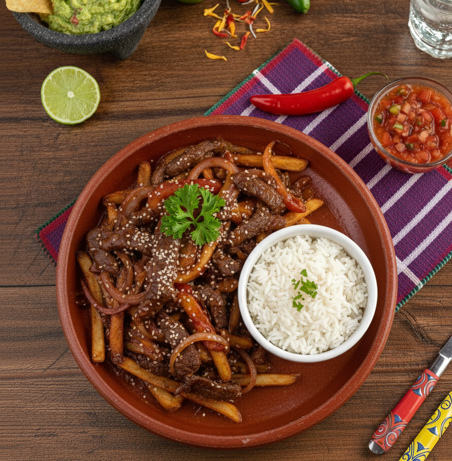Two worlds, Japan and Peru. Stir-fried beef with onions, tomatoes, and fries.