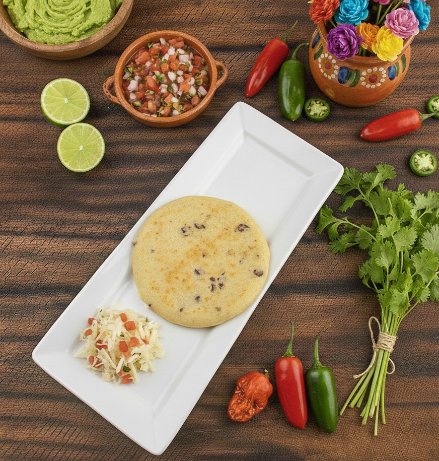 Thick corn tortillas stuffed with cheese, beans, or meat, grilled until golden.