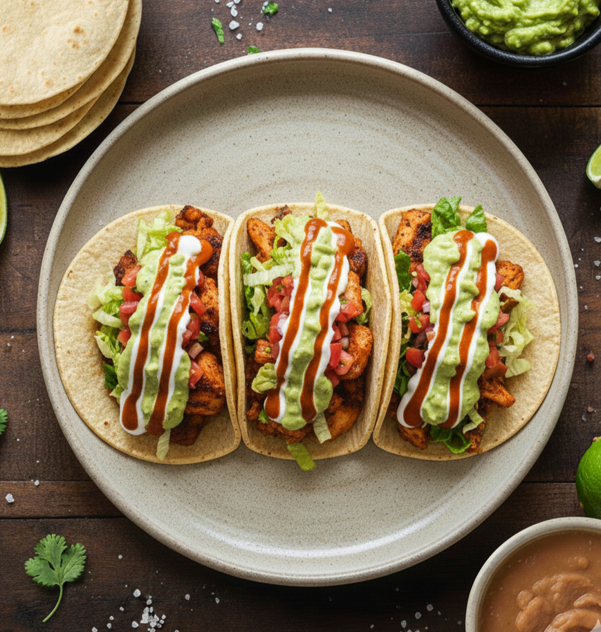 Soft corn tortillas filled with seasoned meat, fresh salads, and tasty dressings.